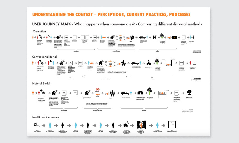 In order to meet project objectives, Goin’green follows a double diamond methodology. The discover phase involves an in depth analysis on: existing disposal methods, the role of the funeral industry in the status quo, novel and conceptually challenging disposal methods, perceptions around death, and communication strategies involving death. This phase uses methods such as interviews, user journey maps, contact with stakeholders, social media engagement and an online survey. The define phase harmonises all the critical insights and observations into key themes and narrows down the focus through a persona and defines a brief. The develop phase first responds to the brief with potential ideas which are then refined. First iterations of the design outcomes are developed and prototyped at a workshop and a feedback session. The deliver phase finalises the design outcomes taking the final feedback into consideration.