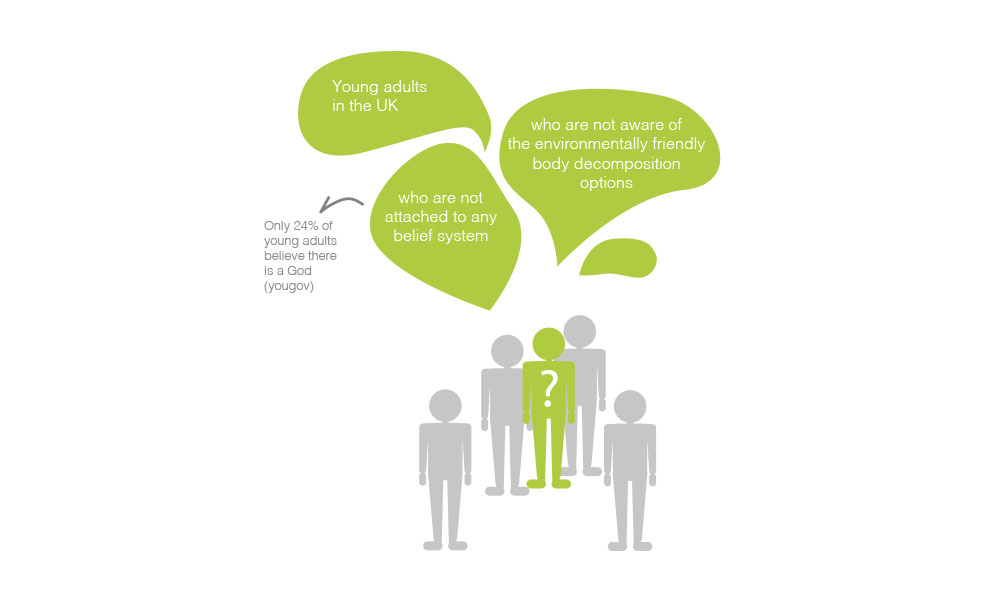 Will our bodies become a burden or a gift for the planet? Can we consider human body as a resource/product/package?, Which parts of our bodies are recyclable/reusable?, How far would we go for sustainability? Would we use products that are made of human remains? How can we reduce our carbon footprint at the very end of our lives? Can thinking our bodies as part of material cycle affect the way we live? Will we feel better connected to nature or seperated from it?